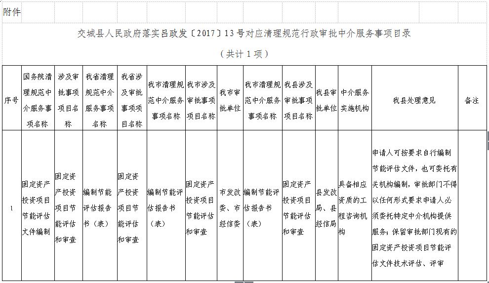 附件:交城县人民政府落实吕政发〔2017〕13号对应清理规范的行政审批中介服务事项目录(共计1项)