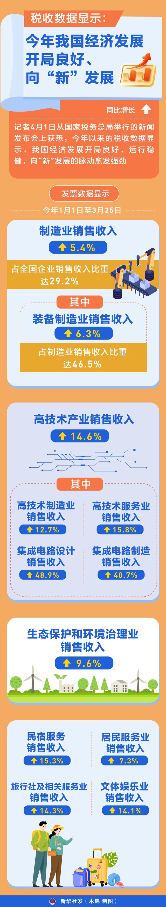 记者4月1日从国家税务总局举行的新闻发布会上获悉,今年以来的税收数据显示,我国经济发展开局良好、运行稳健,向“新”发展的脉动愈发强劲。