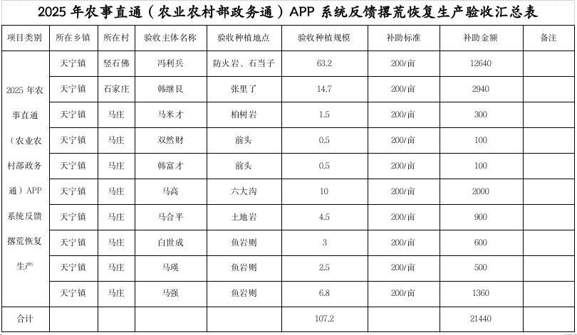 根据晋农发[2025]37号《山西省农业农村厅关于下达2025年省级第四批农业相关转移支付资金使用计划及任务清单》及交办发[2025]7号《交城县2024年农业产业高质量发展实施方案》文件精神,经各乡镇认真宣传、组织,各乡镇围绕撂荒地恢复生产开展实施相关工作,并完成了乡镇初验及公示,县农业农村局组织人员对各乡镇本批次验收申报项目进行了抽查验收,共完成107.2亩,现拨付2025农事直通(农业农村部政务通)APP系统反馈撂荒地恢复生产补助资金21440元,现对拨付资金进行公示,公示期限为5个工作日,如有异议,公众可在本信息发布起5个工作日内向交城县农业农村局反映。联系方式:0358-3523042。