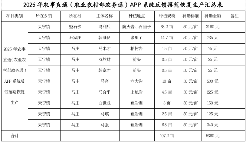 根据晋农发[2025]37号《山西省农业农村厅关于下达2025年省级第四批农业相关转移支付资金使用计划及任务清单》及交办发[2025]7号《交城县2024年农业产业高质量发展实施方案》文件精神,经各乡镇认真宣传、组织,各乡镇围绕撂荒地恢复生产开展实施相关工作,并完成了乡镇初验及公示,县农业农村局组织人员对各乡镇本批次验收申报项目进行了抽查验收,共完成107.2亩,现拨付2025年农事直通(农业农村部政务通)APP系统反馈撂荒地恢复生产补助资金5360元,现对拨付资金进行公示,公众可在本信息发布起5个工作日内向交城县农业农村局反映。联系方式:0358-3523042。