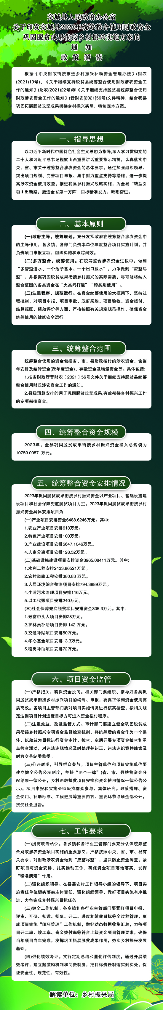 相关文件:关于印发交城县2023年统筹整合使用财政资金巩固脱贫成果衔接乡村振兴实施方案的通知