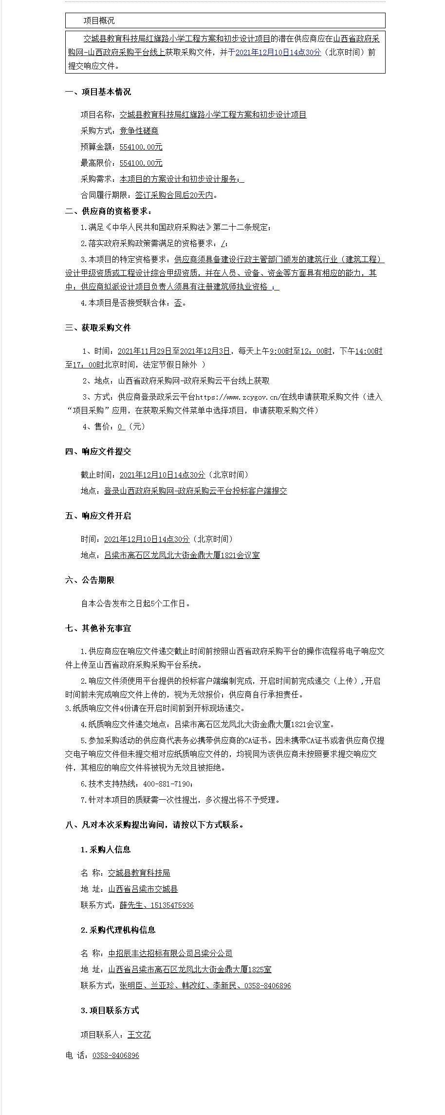 交城县教育科技局红旗路小学工程方案和初步设计项目的采购公告