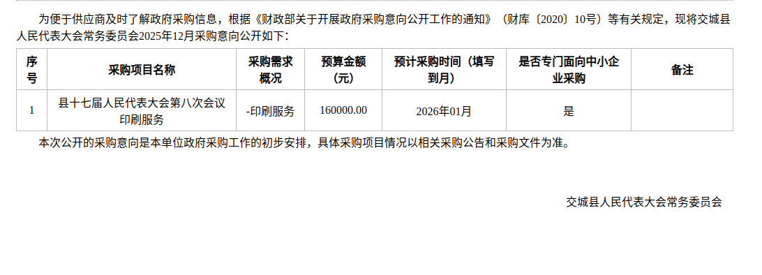 交城县人民代表大会常务委员会2025年12月政府采购意向