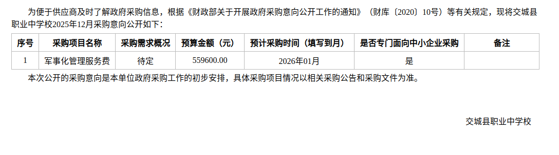 交城县职业中学校2025年12月政府采购意向