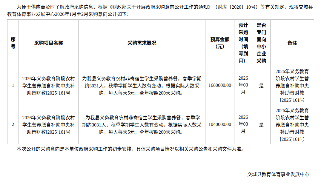 交城县教育体育事业发展中心2026年1月至2月政府采购意向