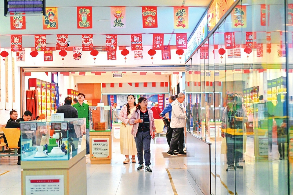4月5日,长治高速服务区内,非遗展览吸引过往游客驻足参观。上党堆锦、黎侯布艺虎等非遗展品整齐陈列,游客在休憩间隙近距离感受三晋非遗魅力,彰显“高速+非遗”的交旅融合特色。山西日报记者范文静摄
